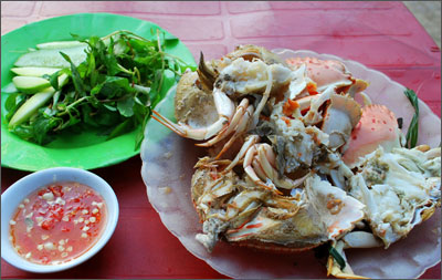 Món cua Huỳnh đế hấp chấm nước mắm tỏi, ớt ăn kèm xoài xanh, rau thơm