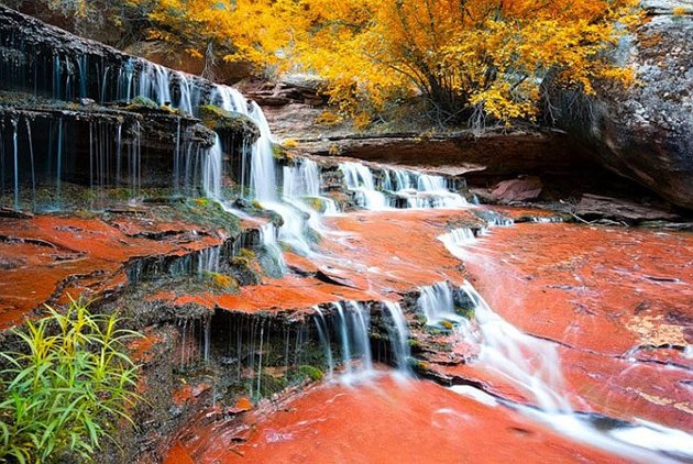 Từ màu xanh lá cây chuyển sang màu đỏ tươi, vàng cam rồi nâu sậm, nổi lên trên nền vàng của cát kết hợp với những mảng tối từ những hốc đá, đã tạo nên một bức tranh sống động mà không nơi nào có được.