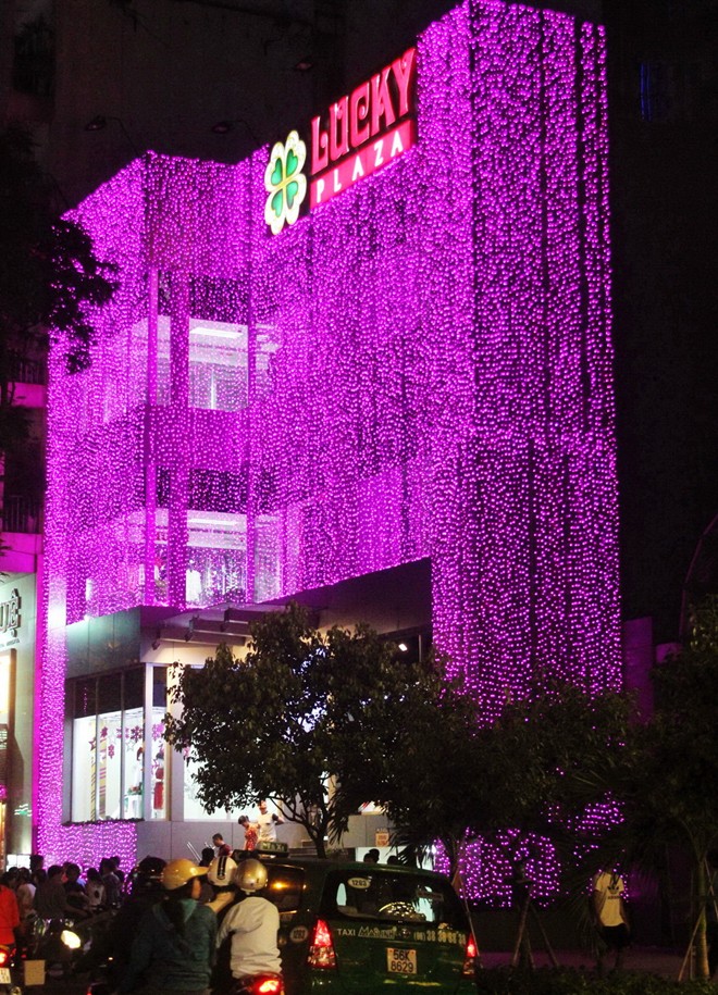 Một trung tâm thương mại trên đường Nguyễn Huệ được bao phủ bởi vô số bóng đèn màu tím.