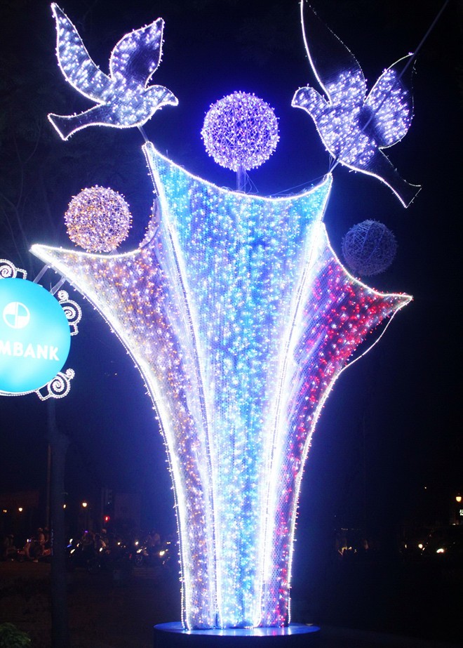 Một dãy cây treo nhiều bóng nhấp nháy trước UBND TP.