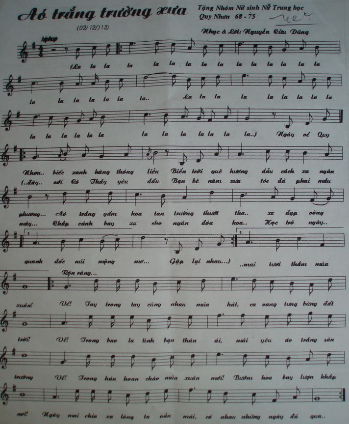 Ban biên tập cdnth6875.org xin giới thiệu đến các bạn trang nhà bản nhạc “ÁO TRẮNG TRƯỜNG XƯA” của Nhạc sĩ Nguyễn Cửu Dũng . Anh là phu quân của bạn Minh Nhơn ,cựu học sinh Nữ Trung Học 68-75 . Anh sáng tác bài này để riêng tăng cho các bạn cựu nữ sinh Nữ Trung Học 68-75 , nhân ngày họp mặt KỶ NIỆM 46 NĂM NGÀY VÀOTRƯỜNG vừa diễn ra hôm 16 / T.Giêng / Giáp Ngọ