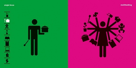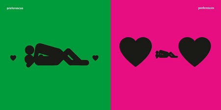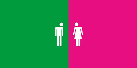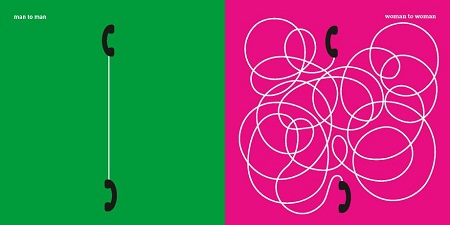 Hình ảnh được phân chia với hai màu riêng biệt. Màu xanh tượng trưng cho suy nghĩ của đàn ông và màu hồng tượng trưng cho suy nghĩ của phụ nữ